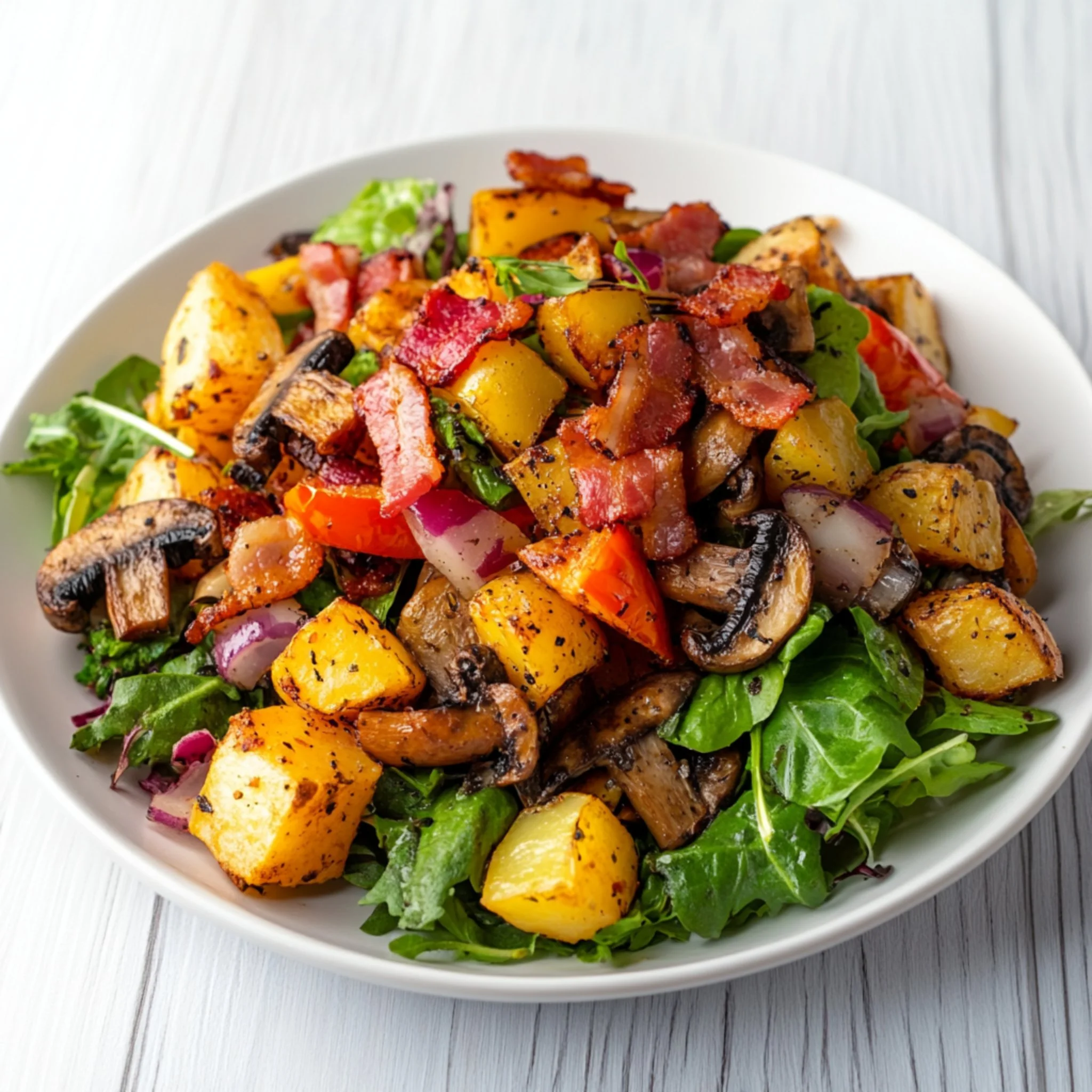 Warm organic greens, roasted peppers, mushrooms, and golden potatoes. Tossed with our house Golden Roots sauce and your choice of crumbled bacon. Nourishing, energizing, and customizable with extra protein or toppings.