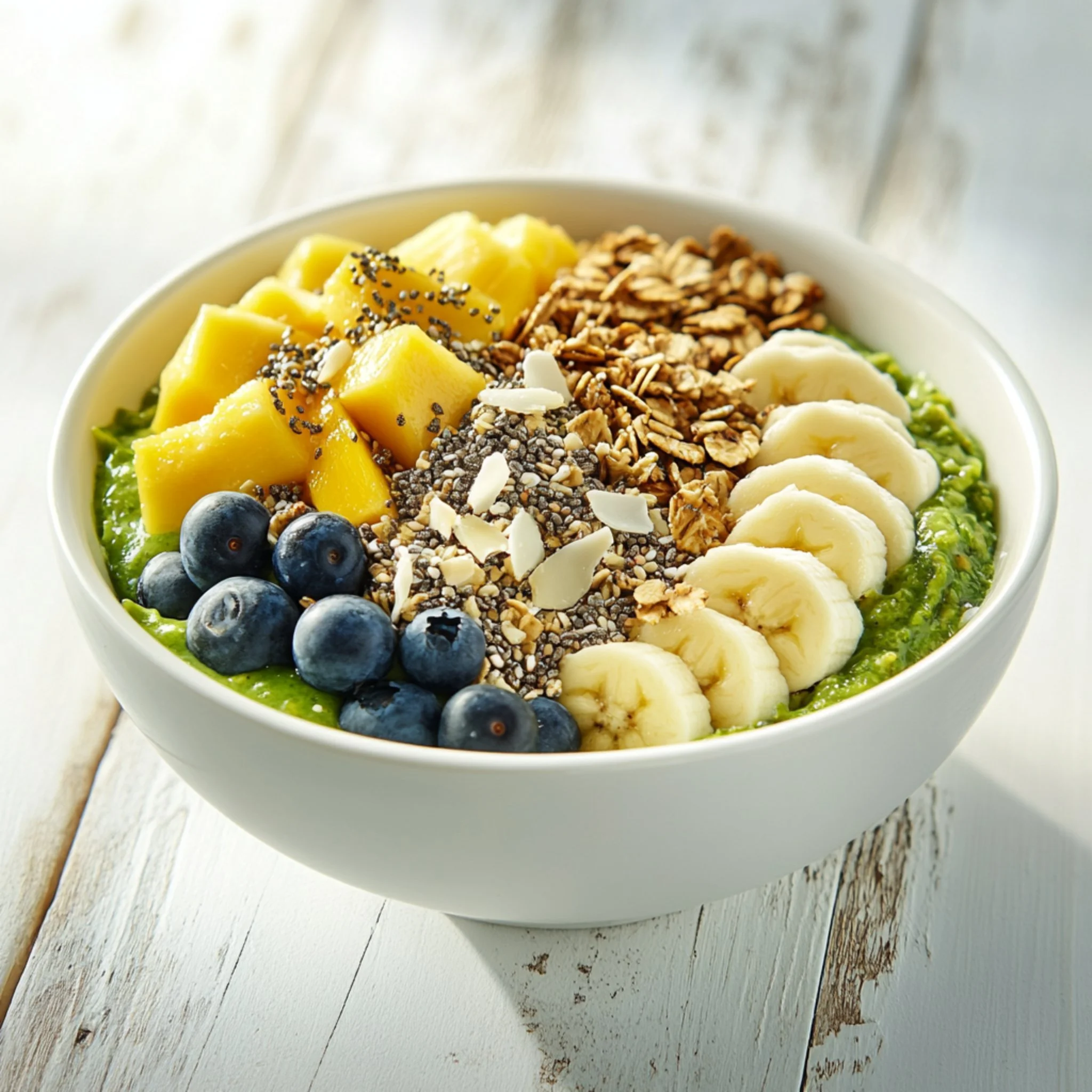Smooth blend of spinach, kale, mango, pineapple, banana, and coconut milk. Finished with granola and two fruits. Nutrient-packed and energizing.