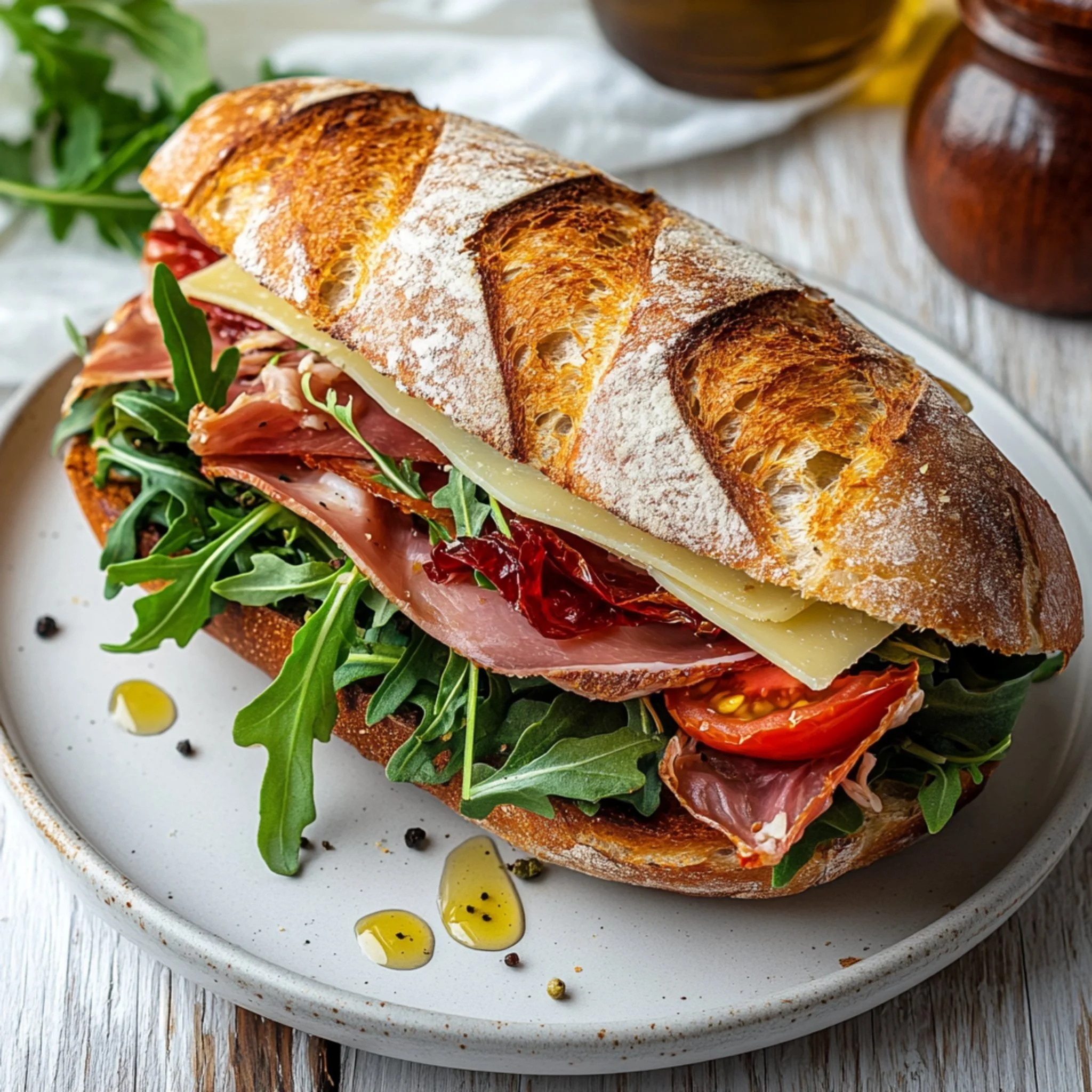 Thinly sliced prosciutto layered with fresh arugula, sun-dried tomato, shaved Parmesan, and our signature green vitality sauce. Served on sourdough bread. Light, savory, and packed with bold flavor.