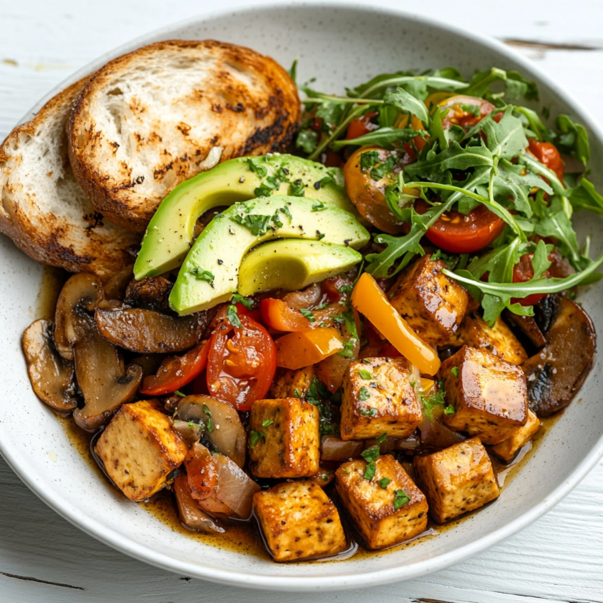 Seasoned tofu sautéed with organic peppers, onions, and mushrooms, served with vegan sausage and sliced avocado. Comes with toasted sourdough and roasted potatoes or house salad. A balanced, plant-powered plate to fuel your day.
