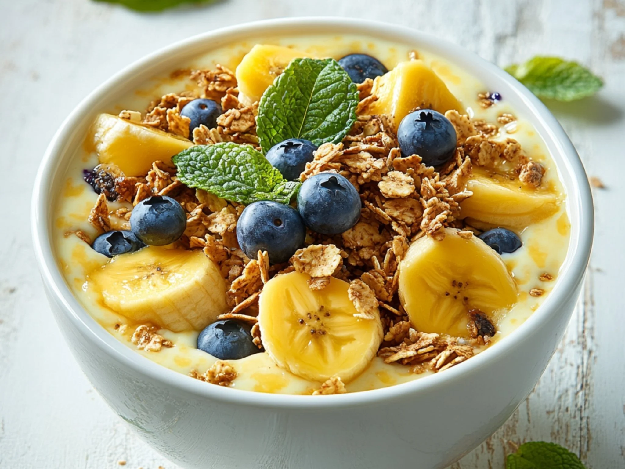Mango, pineapple, banana, and coconut milk blended into a tropical base. Topped with granola and two fruits. Bright, fruity, and naturally soothing.